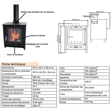 Aperçu 379,00 €543,00 €Ce poêle à bois traditionnel est conçu en acier épais pour une plus grande production de chaleur et une meilleure durabilité. Il possède un sol en fonte et un tiroir à cendres pour simplifier le nettoyage. Les poignées sont fabriquées en acier inoxydable. Il dispose d'un système de verre propre. Ce poêle à inertie vous permet de chauffer un volume de 200 m3 (soit environ 80 m2 de surface). Son rendement élevé de 79% diminue la consommation de bois et le rend compatible au crédit d'impôt. Il a une puissance nominale de 8,8 KW et une puissance maximale de 12,6 kW. La taille compacte de ce poêle assure le gain de place. Son foyer est prévu pour des bûches de 45 cm maximum. Sortie des fumées par le dessus avec un diamètre de 150 mm. Le réglage d'entrée d'air s'opère grâce à une poignée située en dessous de la porte vitrée. Il est recommandé de conserver des distances de sécurité devant et autour du poêle. Ainsi, ne placez pas d'objets ou de matérieux inflammables à 80 cm devant et à 50 cm autour du poêle. Ce poêle de masse est certifié Éco Design 2022. Fabriqué en Union Européenne. Testé et validé dans un Laboratoire Européen. Conforme aux normes: EN 13240:2001, EN 13240:2001/A2:2004, EN 13240:2001/AC:2006, EN 13240:2001/A2:2004/AC:2007. CARACTÉRISTIQUES SPÉCIFIQUES : Énergie thermique : 12,6 kW. Rendement : 79 %. Corps : Tôle d'acier de 4 mm. Énergie : Bois de chauffage. Vitre : Verre céramique transparent 4 mm. Puissance nominale : 8,8 kW. Puissance max : 12,6 kW. Température des fumées : 213 C°. Volume de chauffage : 200 m3. Grille de chambre de combustion en fonte. Tirage : 12 Pa. Consommation de bûches : 3,34 kg/h. Taille des bûches : 45 cm. Poussière : 35 mg/Nm3. NOX : 177 mg/Nm3. Cov : 115 mg/Nm3. Classe énergétique (CE) : A+. DIMENSIONS ET POIDS : Dimensions : H 62,7 x L 51,3 x P 50,6 cm. Dimensions de la chambre à combustion : 47,5 x 42,25 x 34,4 cm. Diamètre cheminée : Ø 150 mm. Poids : 49,5 kg. -