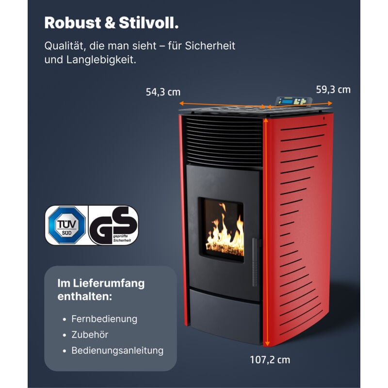 NEMAXX® P18 Poêle à granulés 18 kW jusqu’à 300 m³ – Cheminée électrique [HYDRAULIQUE] – avec mode ECO, Wi-Fi Ready, programmateur hebdomadaire et thermostat de surchauffe – Rouge