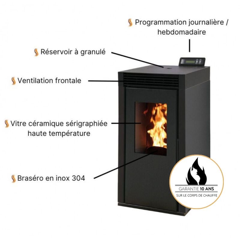 SUPRA Poêle à granulés CALLIOPE 8 NOIR – Acier – Etanche – Noir – 8kW