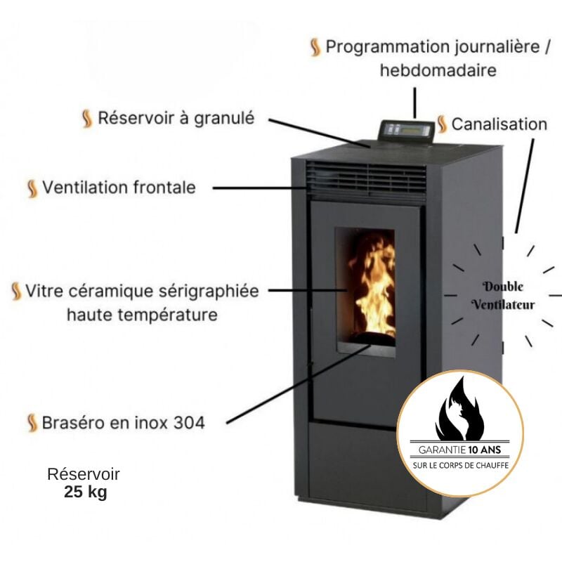Le MARINA 14 canalisable étanche, flamme verte et éco design de fabrication italienne a un très haut rendement (93.40%) Le poêle possède 2 ventilateurs indépendants dont un qui permet de canaliser une pièce adjacente ou un étage avec 5 niveaux de puissance.- Il bénéficie d'une autonomie de 35h grâce à son réservoir à granulés de 25kg