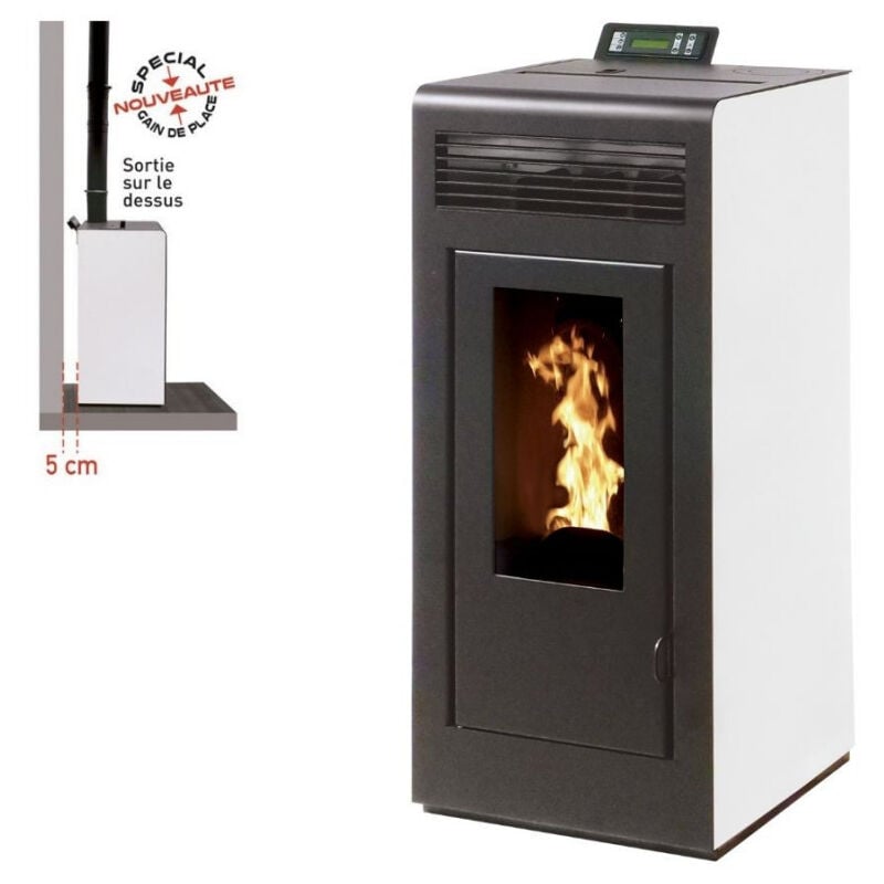 Sa sortie pour les fumées par le dessus au lieu d’une sortie par l’arrière permet d’installer le poêle au plus proche du mur (5 cm)