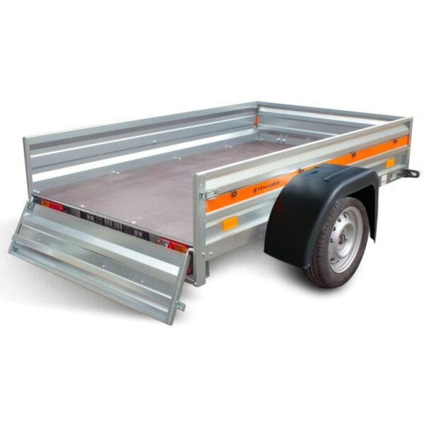 Remorque bâchée basculante de dimensions utiles 205 X 125 X 110 cm, idéale pour le transport de divers matériaux tels que le sable, les remblais ou le bois. Elle est équipée de ridelles en acier galvanisé de 30 cm de haut et d’un support de bâche de 80 cm, offrant une hauteur totale de 110 cm du plancher à la bâche. La remorque inclut une bâche et une armature, ainsi qu’une ridelle arrière ouvrante, rabattable et amovible.